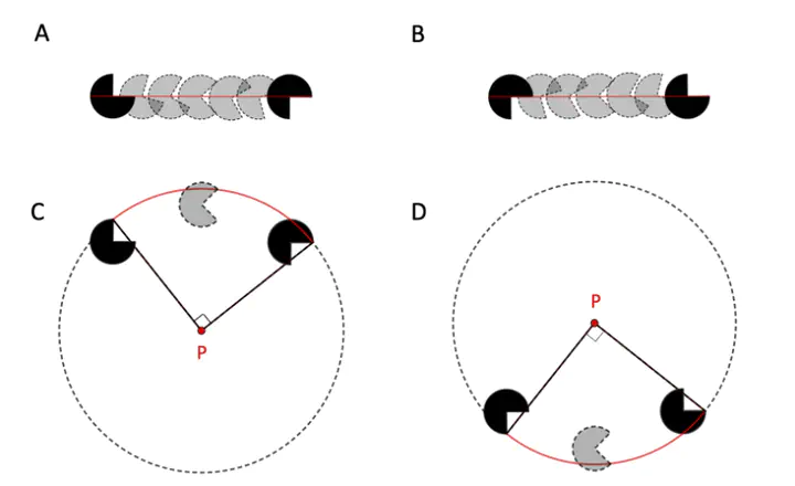 An illustration of the paths defined by Newtonian physics (A and B) and kinematic geometry (C and D) with Pacmen-shaped objects. Black Pacmen denote examples of presented stimuli, whereas gray Pacmen denote the represented intermediate step(s). The path defined by Newtonian physics is a straight line (A and B). The paths defined by kinematic geometry are curved (C and D)[[1]]. In the case of kinematic geometry, point P is the unique center of rotation for the 90° angular difference between the Pacmen. The red paths – curved upward (C) and downward (D) – are the kinematically shorter paths compared to the dashed black paths. It is important to note that although the absolute curved arcs, defined by kinematic geometry, are longer than the length of a straight path defined by Newtonian physics, the lengths of the arcs provide the kinematically shortest paths (i.e., the shortest path as defined by the unique center of rotation), given the position and angular difference of the objects.